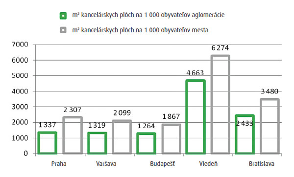 Počet m2 kancelárskych plôch na 1 000 obyvateľov aglomerácie a 1 000 obyvateľov mesta Aglomerácia: Praha 2,1 mil. obyv., Varšava 2,7 mil. obyv., Budapešť 2,5 mil. obyv., Viedeň 2,3 mil. obyv., Bratislava 616-tis. obyv.