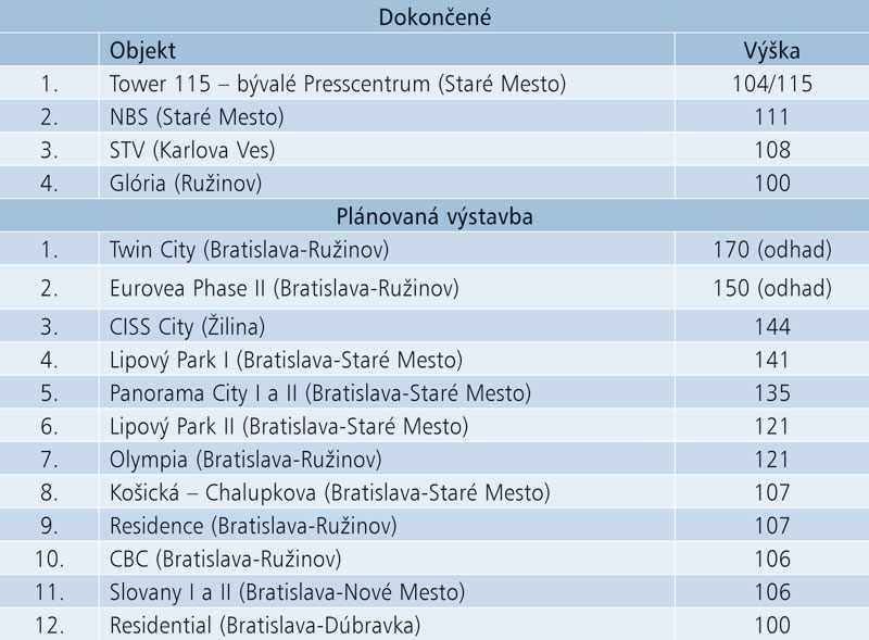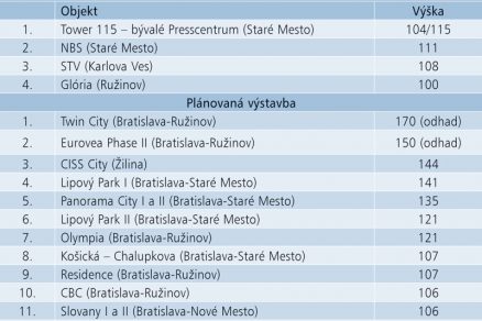 Snahe umiestniť na čo najmenší pôdorys čo najviac úžitkovej plochy sa úspešne prispôsobuje aj Slovensko. Výška administratívnych budov rastie teda postupne aj u nás. Drvivá väčšina z nich stojí alebo v najbližšom čase bude stáť predovšetkým v Bratislave, po vysokých budovách však už začínajú poškuľovať aj krajské mestá. Vyše stometrovú pýchu českých susedov City Tower na pražskom Pankráci sme už prekonali a pomaly sa budeme môcť začať porovnávať aj s veľkými európskymi metropolami.