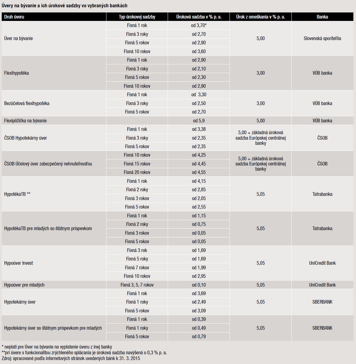 Z vyjadrenia Národnej banky Slovenska vyplýva, že rekordne nízke úrokové sadzby na úvery na bývanie stimulujú domácnosti k úvahám obstarať si vlastné bývanie. Do bývania dlhodobo smeruje okolo 70 % úverov domácností. Celkový objem úverov na bývanie dosiahol na konci roku 2014 hodnotu 16,9 miliardy eur. Je možné predpokladať, že v roku 2015 úrokové sadzby zostanú aj naďalej na nízkej úrovni. Na druhej strane však nízke ceny nehnuteľností, zvýšený dopyt a lacné hypotéky dávajú predpoklad na rast cien, čo môže mať za následok pomalý rast priemerných cien nehnuteľností, a to predovšetkým tých, o ktoré je najväčší záujem. Snahou finančných inštitúcií bude aj naďalej získať čo najviac klientov a poskytnúť im rôzne formy úverov na bývanie s atraktívnou úrokovou sadzbou. To však nemusí trvať večne. Plánované zadlženie sa hypotekárnym úverom je potrebné dôkladne si naplánovať. Treba si uvedomiť, že ide o dlhodobý úver a v priebehu niekoľkých rokov môže nastať situácia, keď úrokové sadzby začnú stúpať, následkom čoho budú rásť aj mesačné splátky. To znamená, že neúmerne vysoké úvery splácané na hranici príjmu môžu spôsobiť v budúcnosti veľmi vážne finančné problémy.