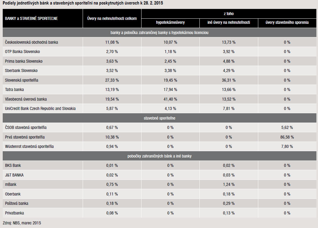 Záujem o úvery na bývanie potvrdzuje skutočnosť, že ich objem poskytnutý bankami sa vo februári tohto roka v porovnaní s januárom zvýšil o 152,6 mil. eur. Podľa údajov Národnej banky Slovenska tak predstavoval ku koncu druhého mesiaca sumu 17,139 mld. eur. Väčšinu z celkového objemu úverov na bývanie tvorili iné úvery na nehnuteľnosti, ktorých stav sa zvýšil o 115,4 mil. eur, nasledovali klasické hypotekárne úvery, ktorých objem sa zvýšil o 32 mil. eur a nakoniec sú to úvery zo stavebného sporenia, ktorých stav stúpol o 5,2 mil. eur. Podiely jednotlivých bánk na poskytnutých úveroch uvádza tabuľka č. 2 a ich celkový objem vo februári 2015 graf č. 2.