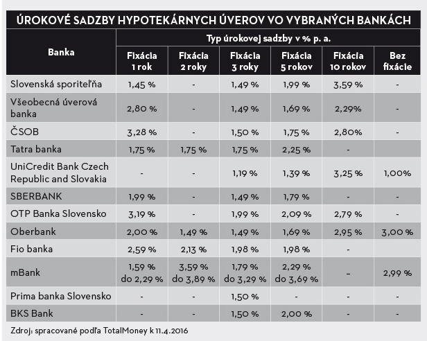V skutočnosti nejde iba o nízke úrokové sadzby úverov, ale aj o celkovú ekonomickú situáciu v štáte, napríklad rast príjmov, vznik nových pracovných príležitostí, ako aj vývoj cien nehnuteľností (bytov a rodinných domov, graf 1), čo má následne vplyv na dostupnosť bývania. Rekordne nízke úrokové sadzby na úvery na bývanie stimulujú domácnosti k úvahám obstarať si vlastné bývanie. Úročenie hypotekárnych úverov závisí od viacerých faktorov. Je potrebné si uvedomiť, že väčšina finančných ústavov informuje len o minimálnej výške úroku, ktorá však závisí od posúdenia bonity žiadateľa. Dôležitá je aj dĺžka fixácie úrokovej sadzby. Všeobecne však platí – čím dlhšia fixácia, tým vyšší úrok, pretože garancia úroku na dlhšie časové obdobie znamená pre banku vyššie riziko. Pri očakávaní znižovania úrokových sadzieb je vhodná fixácia úrokovej sadzby na kratšie obdobie. Na druhej strane, alternatívou fixnej úrokovej sadzby je variabilná úroková sadzba (bez fixácie), ktorá vývoj aktuálnych trhových úrokových sadzieb zohľadňuje najlepšie. Poznamenávame, že hypotekárny úver (v zmysle § 68 zákona č. 483/2001 Z. z. o bankách a o zmene a doplnení niektorých zákonov v znení neskorších predpisov), ktorý poskytujú komerčné banky, je dlhodobý úver, účelovo určený na nákup, výstavbu, rekonštrukciu a údržbu tuzemských nehnuteľností, zabezpečený záložným právom k nehnuteľnosti, financovaný (refinancovaný) prostredníctvom vydávania a predaja hypotekárnych záložných listov.