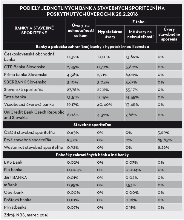 Záujem o úvery na bývanie potvrdzuje skutočnosť, že ich objem poskytnutý bankami bol ku koncu februára 2016 na úrovni 19 421 654 tisíc €. Väčšinu z celkového objemu úverov na bývanie tvorili iné úvery na nehnuteľnosti, nasledovali hypotekárne úvery a nakoniec sú to úvery zo stavebného sporenia. Podiely jednotlivých bánk na poskytnutých úveroch uvádza tabuľka č. 2 a ich celkový poskytnutý objem vo februári 2016 graf č. 2.