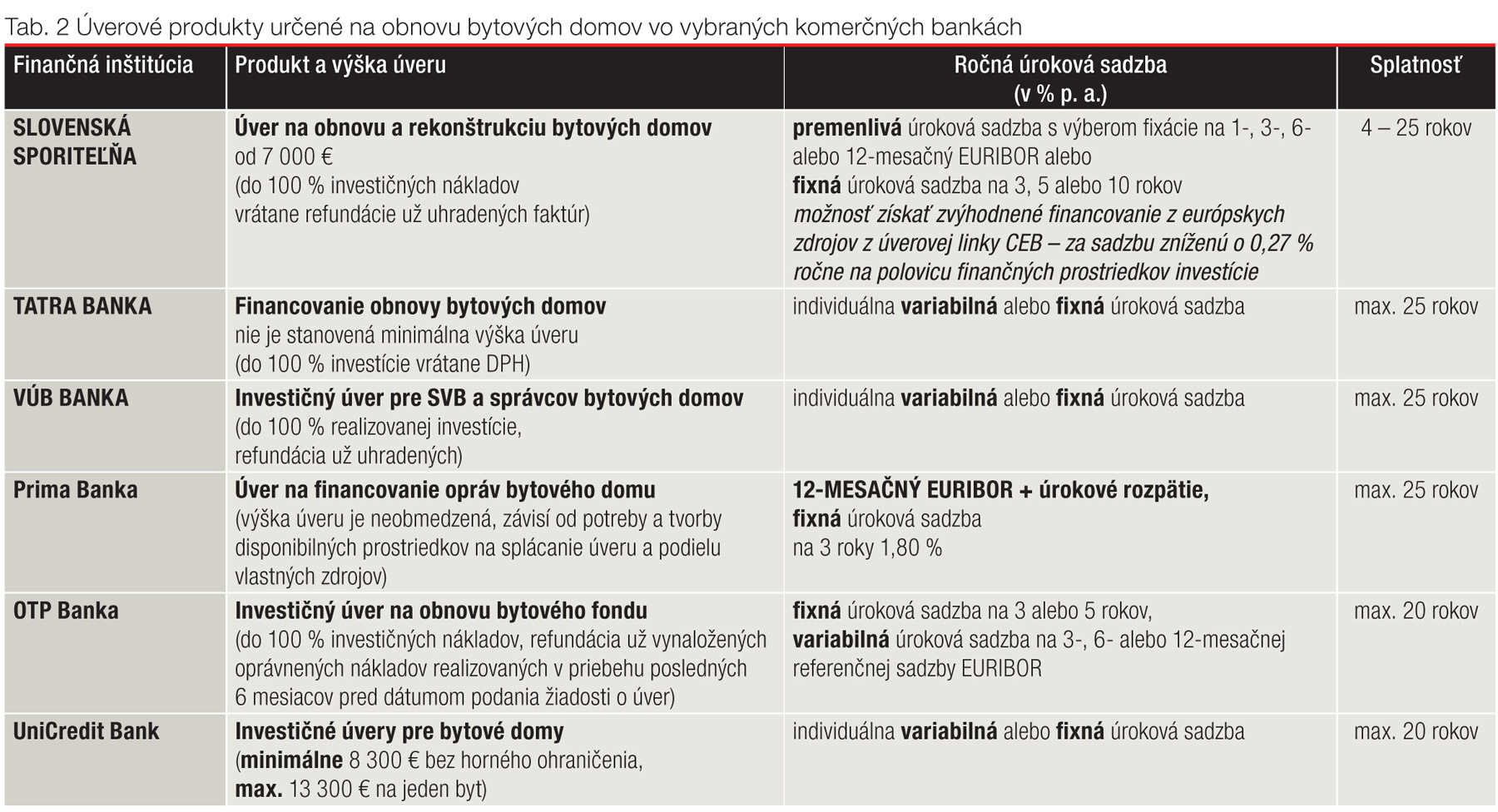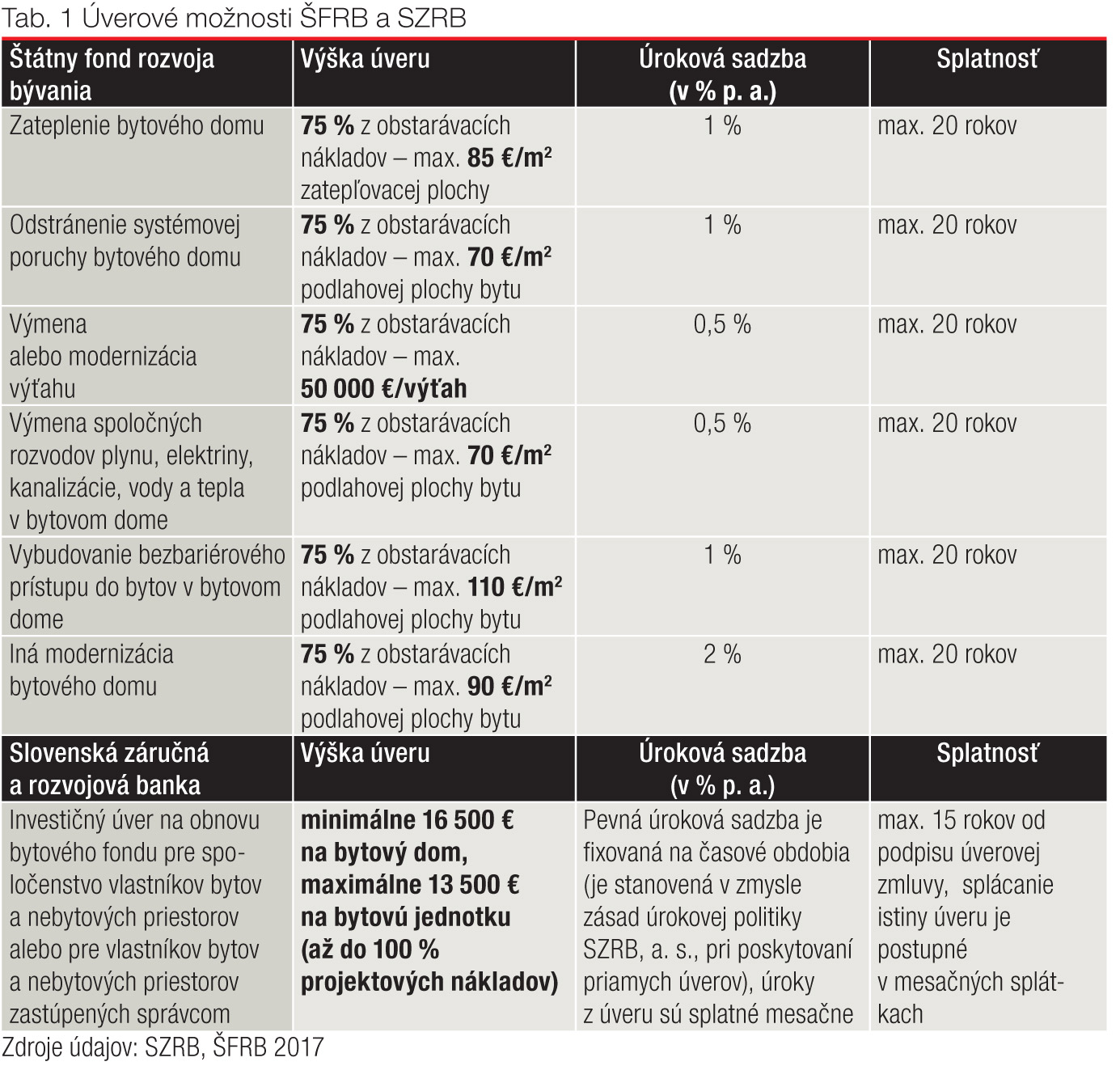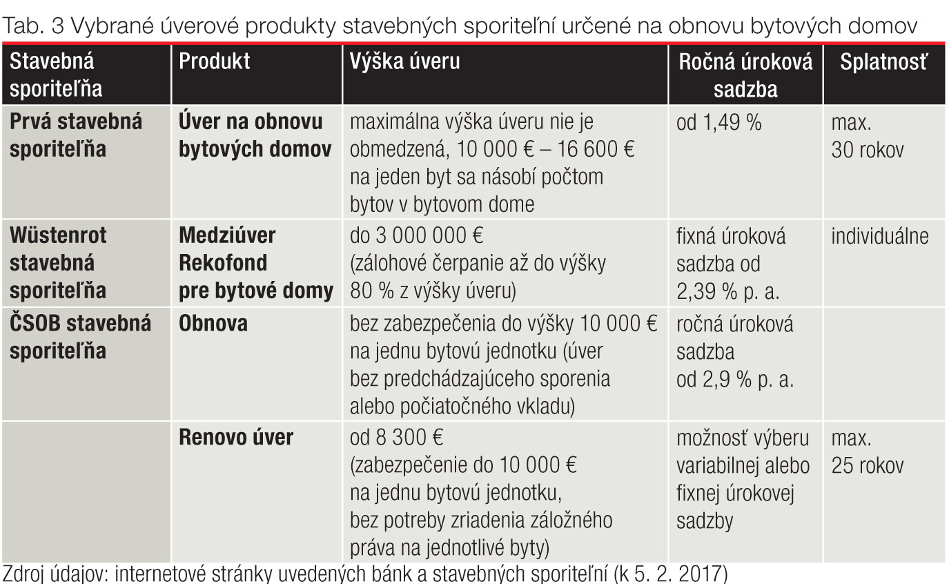 Významný a pozitívny vplyv na realizáciu obnovy bytových domov na Slovensku má už viac ako dve desaťročia podpora štátu. Ide predovšetkým o rôzne úverové možnosti poskytované Štátnym fondom rozvoja bývania (ŠFRB), ktoré sa flexibilne inovujú a dopĺňajú (aktuálny prehľad uvádza tab. 1).
