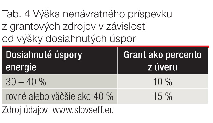 Výhodou je možnosť získať nenávratný príspevok z grantových zdrojov EÚ po úspešnej realizácii projektu v závislosti od výšky dosiahnutých úspor (tab. 4). Minimálna úroveň úspor energie, ktorú je potrebné dosiahnuť, je 30 % celkovo dodanej energie hodnotenej ako rozdiel medzi objemom pred obnovou a po nej. Zúčastnené banky sú Slovenská sporiteľňa, a. s., VUB banka, a. s., a OTP Banka Slovensko, a. s.