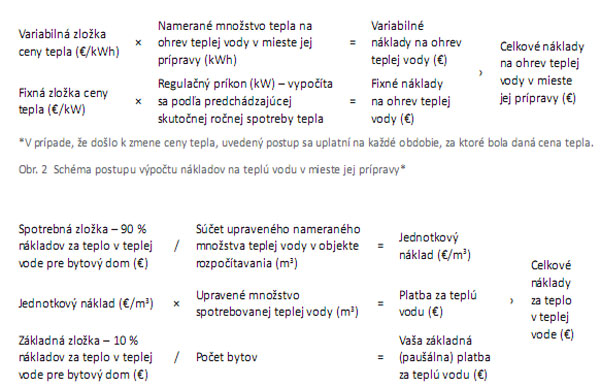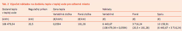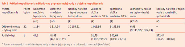 Náklady za teplo dodané v teplej vode do bytového domu sa delia na základnú a spotrebnú zložku (obr. 3). Základná zložka tvorí 10 % a spotrebná 90 %. Základná zložka sa rozpočítava medzi konečných spotrebiteľov rovnakým dielom pre každý byt v bytovom dome. Zahŕňa paušál, ktorý zohľadňuje čiastočné straty v cirkulácii teplej vody potrebnej na zabezpečenie prístupu k teplej vode v dohodnutom časovom rámci. Spotrebná zložka sa rozpočítava medzi konečných spotrebiteľov v pomere upravenej spotreby vody v m3 nameranej na vodomere v byte k súčtu upravených spotrieb všetkých vodomerov teplej vody v bytovom dome (tab. 3).