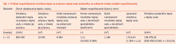 Celkové náklady na prípravu teplej vody vyplývajúce z údajov zaznamenaných určenými meradlami (na teplo a na vodu) sa rozpočítavajú v pomere k nameraným množstvám teplej vody na všetkých odberných miestach alebo v pomere k súčtu nameraných množstiev teplej vody u konečných spotrebiteľov (podľa spôsobu distribúcie) (tab. 1 a 2). Vo vyúčtovaní možno detaily o pomerovom delení nájsť prostredníctvom takzvaných koeficientov, ktoré zodpovedajú úprave nameraného množstva teplej vody na odberných miestach alebo u konečných spotrebiteľov. Hoci sa koeficienty v príslušnej legislatíve nespomínajú, správcovia bytových domov ich vo vyúčtovaní bežne uvádzajú, aby konečným spotrebiteľom vysvetlili, ako sa dopracovali k výsledným nákladom za ohrev teplej vody. V drvivej väčšine prípadov je súčet vodomerov v bytoch a nebytových priestoroch nižší ako hodnota nameraná vodomerom v mieste prípravy teplej vody. Príčiny môžu byť rôzne – od samotnej systémovej chyby pri veľkom počte vodomerov cez poruchy časti vodomerov, chyby v odpočte a podobne.