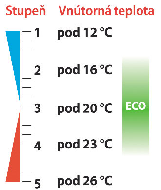 1 – 2: v miestnosti sa nezdržujeme, pri odchode do práce, na dlhší čas alebo v spálni (pre zdravý spánok je optimálna teplota vzduchu 16 až 18 °C)