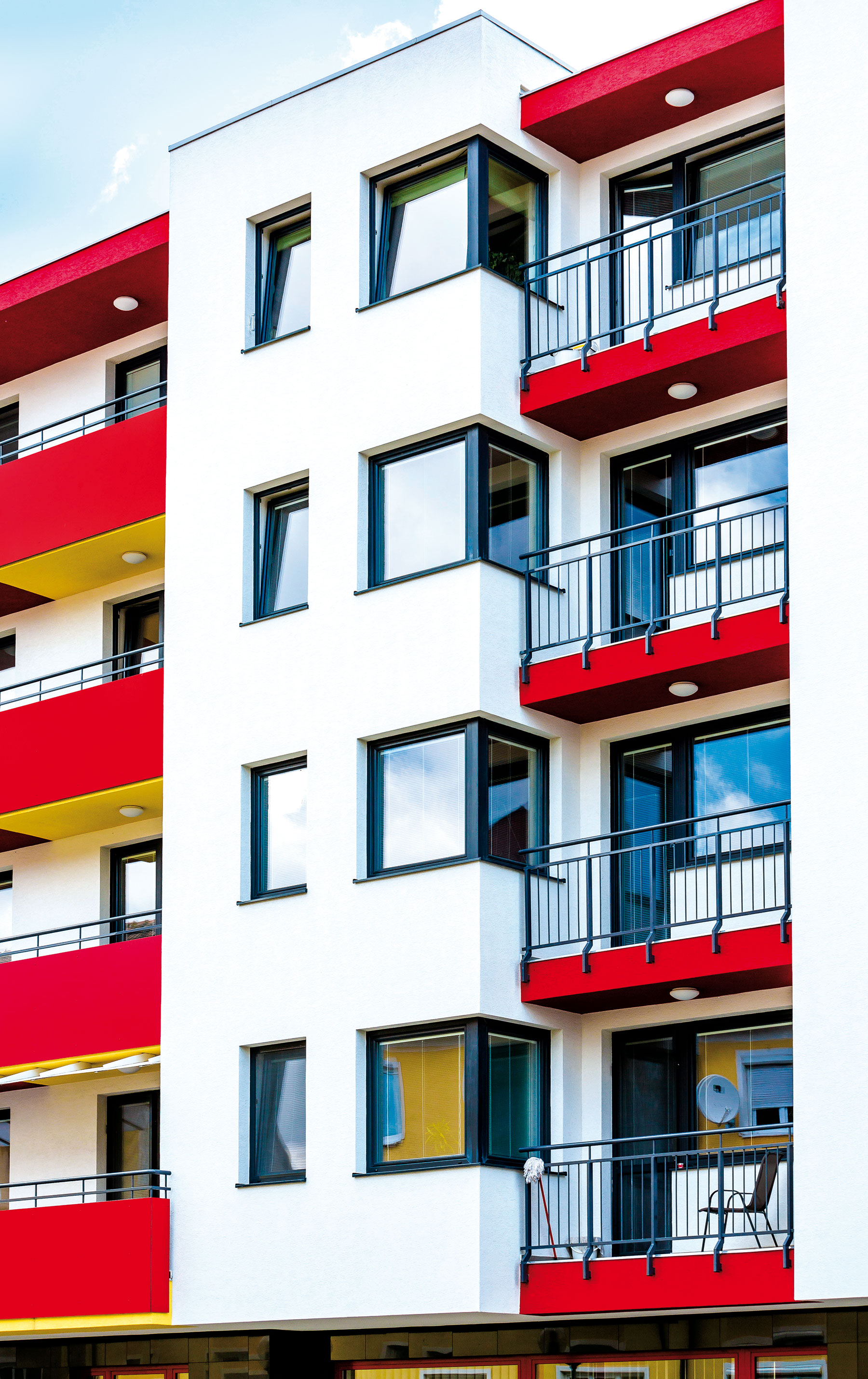 Na bytovom dome Pribina sú okná dôležitým prvkom fasády. Antracitové vyhotovenie plastových okenných profilov evokuje hliník. Zvnútra sú okenné profily v neutrálnej bielej farbe, aby si užívatelia mohli doladiť interiér podľa vlastných predstáv.