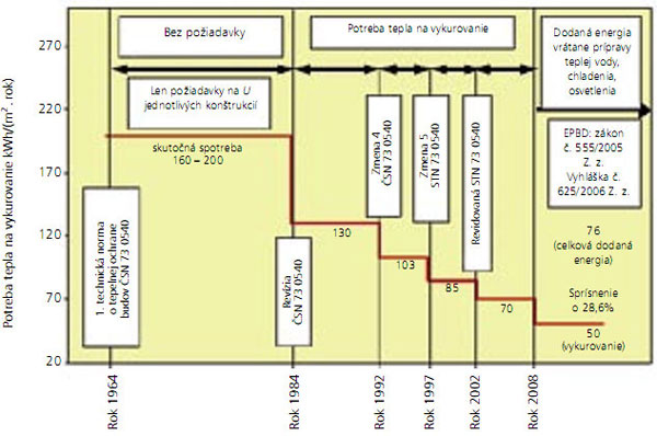 Obr. 3 Vývoj požiadaviek na potrebu tepla na vykurovanie pre bytové domy