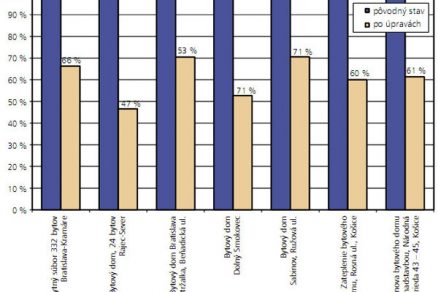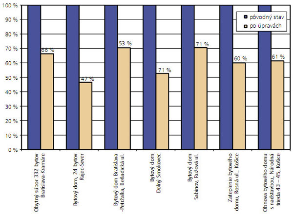 Na obr. 4 sú uvedené výsledky zníženia potreby tepla na vykurovanie pri použití rozličných opatrení. V prípade pilotného projektu 332 bytov Bratislava-Kramáre išlo približne o zlepšenie tepelnotechnických vlastností jednotlivých stavebných konštrukcií na úrovni požiadaviek na obnovované budovy. Okná zostali pôvodné, ale sa zatesnili tesniacimi profilmi. Na bytovom dome Beňadická ul. sa opravili škáry stykov, zatesnili okná, zasklili lodžie a zateplila strecha. V Dolnom Smokovci sa vymenili okná, zateplenie bolo v kvalite požiadaviek na nové budovy, vybudovali sa byty v nadstavbe. Použitím rôznej úrovne opatrení na rozdielnych bytových domoch sa docielilo rozdielne zníženie potreby tepla na vykurovanie od 34 do 53 %.