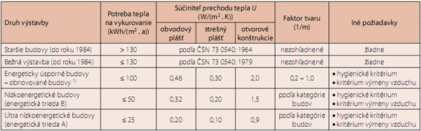 Uplatnenie rozličnej kvality tepelnej ochrany preukazuje možnosti zníženia potreby tepla podľa stanovenej klasifikácie (nízkoenergetické, ultra nízkoenergetické a pasívne budovy), ako aj určenie možných úspor vyplývajúcich z uplatnenej kombinácie tepelnotechnických vlastností stavebných konštrukcií a maximálnej možnej úspory, ktorá slúži ako podklad na stanovenie potenciálu úspor. Podmienky vyplývajú z tab. 1.