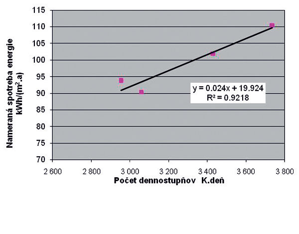 Potreba energie pri normalizovanom počte dennostupňov určená z lineárnej regresie je En,3422 = 102,2 ± 3,1 kWh/(m² . a).