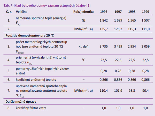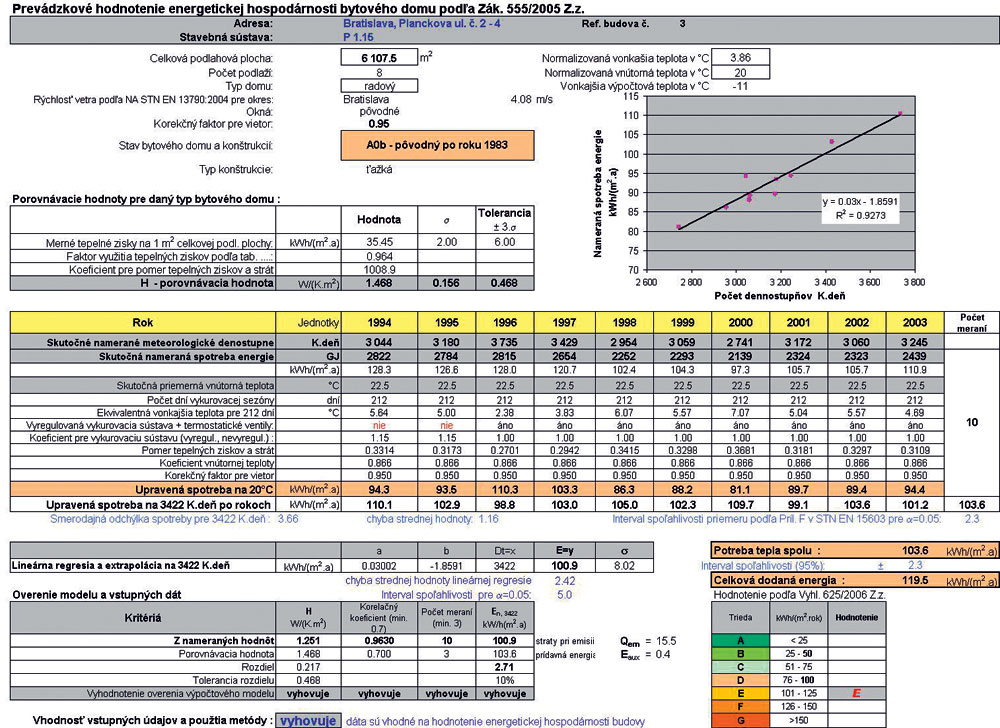 Na prevádzkové hodnotenie sú k dispozícii údaje o nameranej spotrebe tepla na päte bytového domu za štyri roky a klimatické podmienky v rokoch merania vyjadrené počtom meteorologických dennostupňov pri vnútornej teplote 20 °C, ktoré sa pohybovali v rozpätí od 2 954 K . deň po 3 735 K . deň (obr. 2). Na prevádzkové hodnotenie sa použila tabuľka, ktorej vzor je uvedený v STN EN 15603/NA.