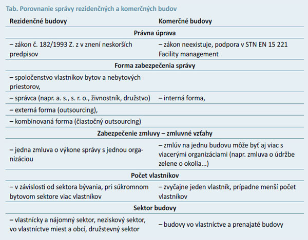 Z porovnania správy rezidenčných a komerčných budov podľa Szabovej [3] vyplývajú charakteristiky uvedené v tabuľke.