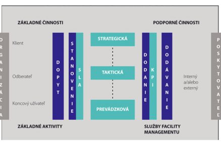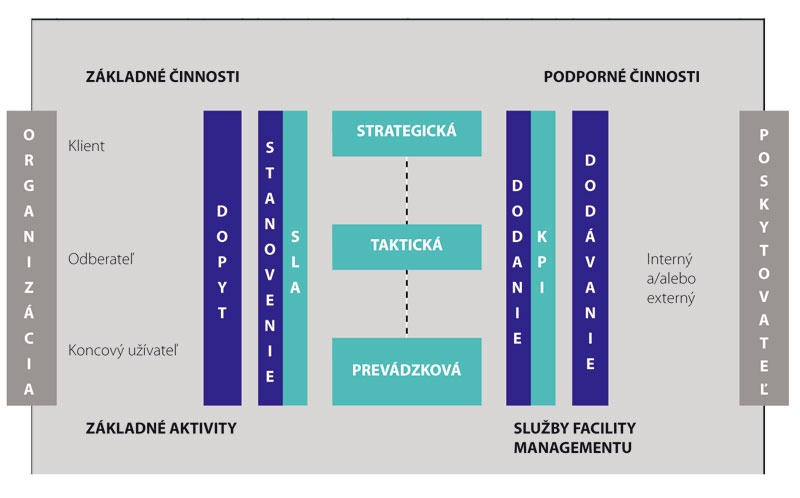 - v prevádzkovej úrovni prebieha dodávanie služieb v súlade s požiadavkami klienta v zmysle podpísanej zmluvy, ktorej súčasťou by mala byť SLAs, ďalej monitorovanie a kontrolovanie procesov dodávania služieb FM (KPIs).