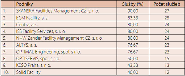 V prípade FM v oblasti výroby ide najmä o riadenie podporných činností vo významnom sektore podnikateľského prostredia v rámci transformácie vstupov a výstupov primárnej činnosti, ktoré zodpovedajú uvedenému spojeniu na trh dodávateľa a odberateľa. Tento proces vyžaduje aj kooperačné vzťahy s inými službami. Tesnosť väzieb je daná predovšetkým charakteristikou podporných činností z hľadiska ich priameho či nepriameho usporiadania v rámci príslušného procesu a prostredia. V tab. 2 sú uvedené špecifikácie počtu poskytovaných služieb v rámci 10 vybraných podnikov poskytujúcich FM služby.
