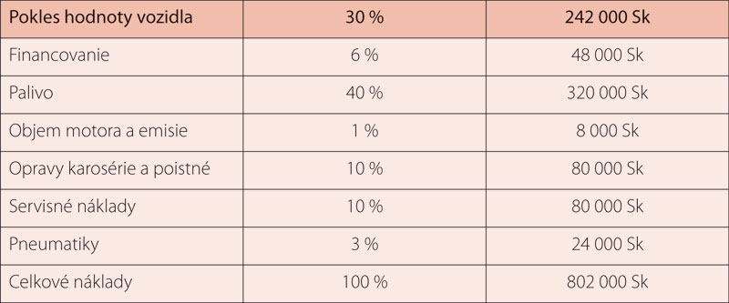 Významnou položkou v nákladoch na prevádzku je palivo, ktoré sa na nich podieľa 30 až 45 %. Nasledujú opravy, ktoré sa kalkulujú spoločne s nákladmi na poistenie automobilu a predstavujú zhruba 10 %. Ďalších 10 % TCO treba rátať na bežné servisné náklady a údržbu vozidla. Do hry vstupujú aj ďalšie faktory s nižšou percentuálnou váhou, ktorá však pri vyjadrení celkových nákladov v korunách vôbec nie je zanedbateľná, nehovoriac o zohľadnení vyššieho počtu automobilov. Je to financovanie vozidla, ktoré znamená zhruba 6 % TCO, ďalšími 3 % prispievajú pneumatiky.