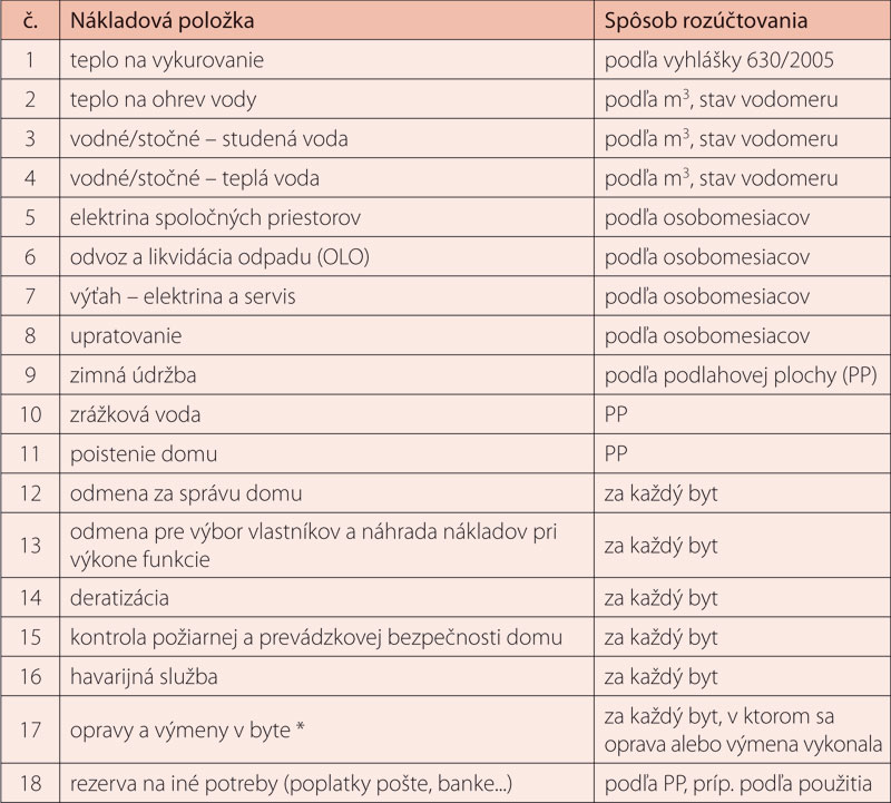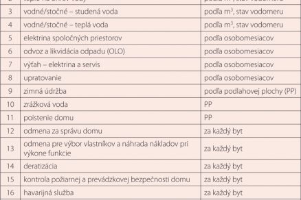 Znamená to, že činnosti v prospech spoločného vlastníctva treba hradiť z fondu prevádzky, údržby a opráv. Hranica medzi spoločným a individuálnym vlastníctvom má byť určená v zmluve o prevode vlastníctva bytu alebo v kúpnopredajnej zmluve. Činnosti v prospech individuálneho vlastníctva sa majú hradiť platbou od vlastníka, v prospech ktorého boli vykonané, prípadne tam, kde sa nedá presne určiť, aké náklady vyvoláva konkrétny vlastník, sa majú rozúčtovať podľa podlahovej plochy bytov na každý byt alebo podľa počtu bývajúcich osôb, teda podľa osobomesiacov. Zvyčajne sa o tom vlastníci bytov dohodnú v znení zmluvy o výkone správy alebo v zmluve o spoločenstve. Ak sa v priebehu roka vyskytnú náklady, ktoré nemožno podľa pravidiel zaradiť, majú byť uhradené z fondu prevádzky, údržby a opráv.