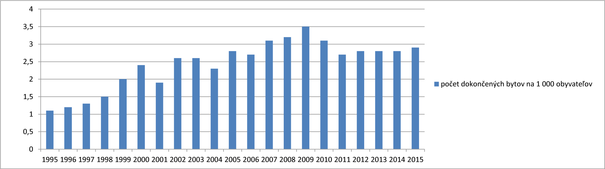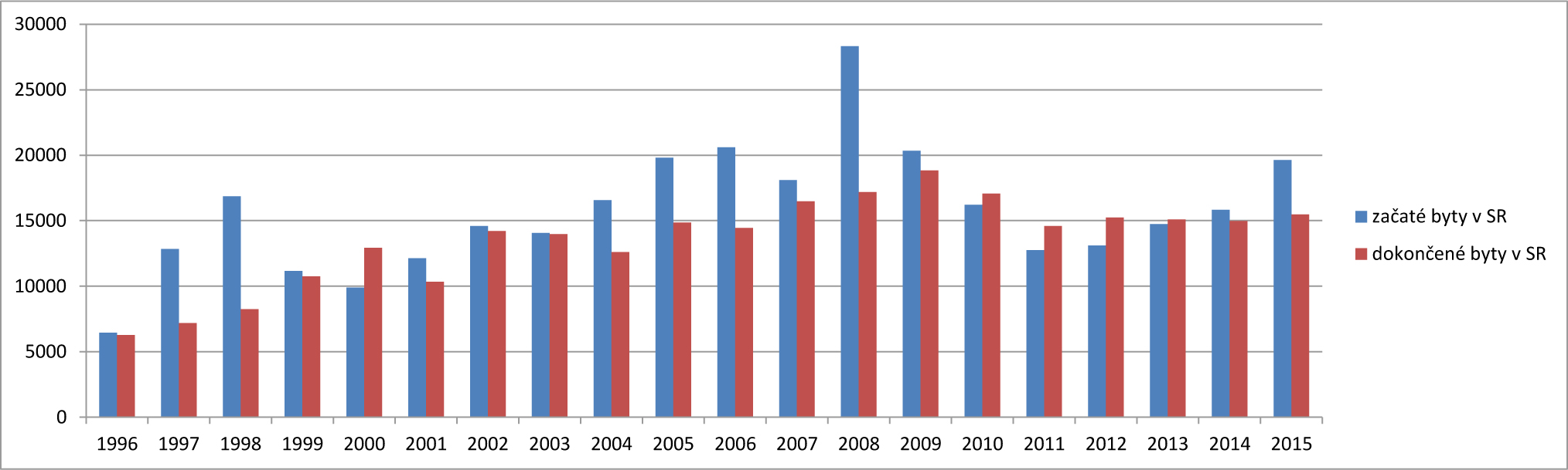 V roku 2015 dosiahol počet začatých bytov hodnotu 19 640 bytov, čo je oproti roku 2014 (15 836 bytov) nárast o 24,02 %. Počet 15 471 dokončených bytov v roku 2015 je oproti roku 2014 (14 985 bytov) tiež vyšší o 3,14 % (obr. 1). V obecnom vlastníctve sa v roku 2015 dokončilo 339 bytov, čo predstavuje v porovnaní s predchádzajúcim rokom zníženie o 341 bytov a neustále výrazne klesajúci trend (obr. 2).