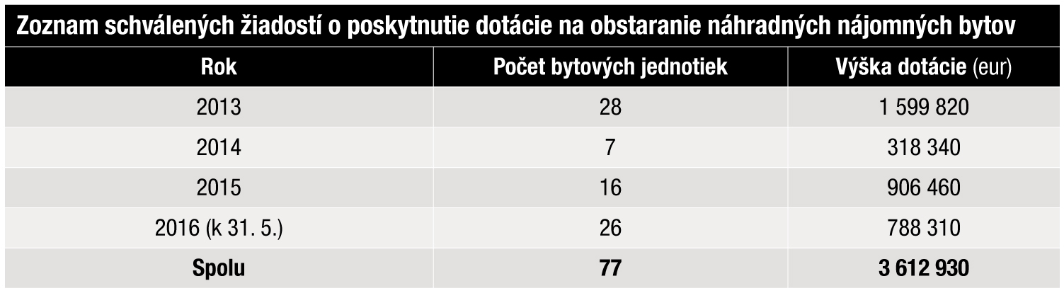 Zo zákona je na obstaranie jedného metra štvorcového bytu vyčlenených maximálne 1 000 eur, v tom sú zarátané aj náklady na vybudovanie potrebnej technickej infraštruktúry a na obstaranie pozemku na výstavbu. V tabuľke je uvedený celkový objem schválených žiadostí obcí o poskytnutie dotácie na obstaranie náhradných nájomných bytov od roku 2013 až k 31. máju 2016.