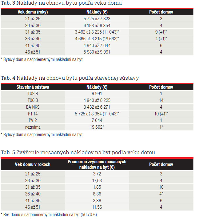 Z údajov vyplýva, že vek domu nie je určujúcim faktorom výšky nákladov na obnovu domu. Napriek horším tepelnotechnickým vlastnostiam obvodových plášťov starších domov a predpokladu väčšej potreby opráv, respektíve modernizácie spoločných častí a zariadení domu, nemožno konštatovať, že starší dom bude mať vyššie náklady na obnovu. To isté platí v prípade porovnania nákladov na obnovu podľa stavebnej sústavy bytových domov.