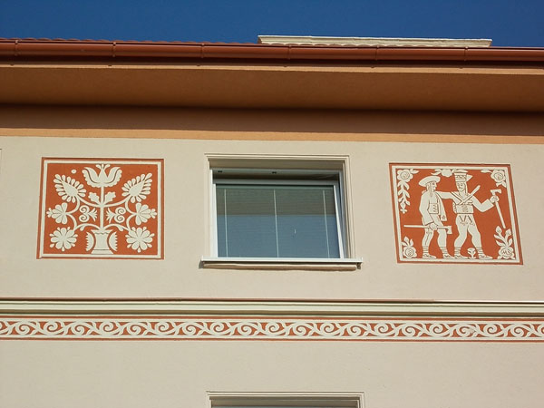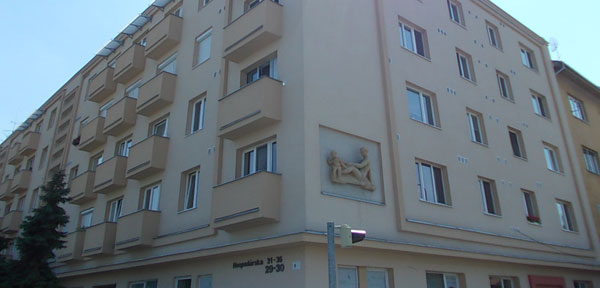Obnovený bytový dom v Trnave. Dom má pri dolnej nárožnej časti umelecký prvok, ktorý bol pri obnove zachovaný.