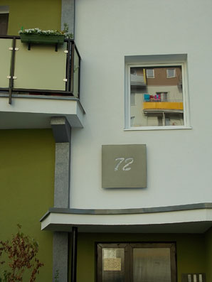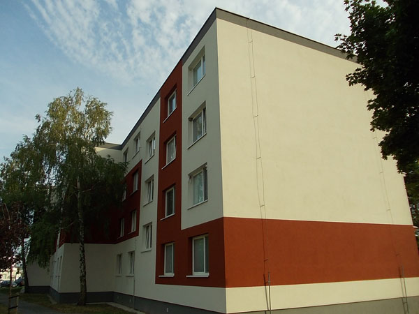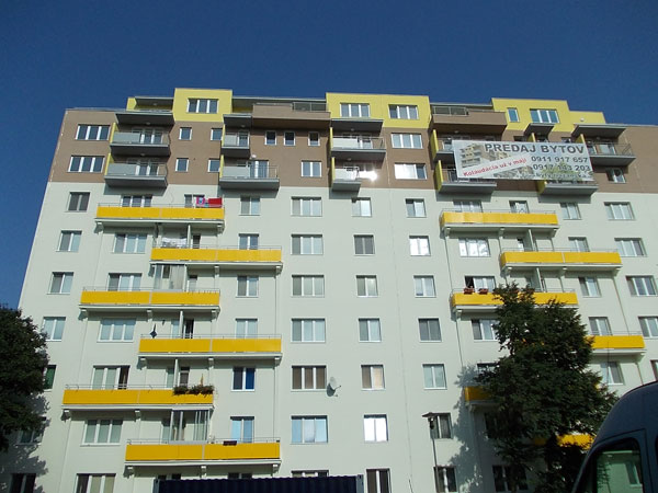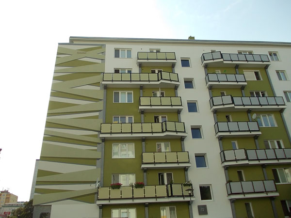 Veľmi zaujímavým riešením fasády je vytvorenie grafických prvkov s efektom vystupovania z priečelia objektu. V takomto prípade vša treba zvoliť správne farebné riešenie omietky. Bytový dom v Bratislave.