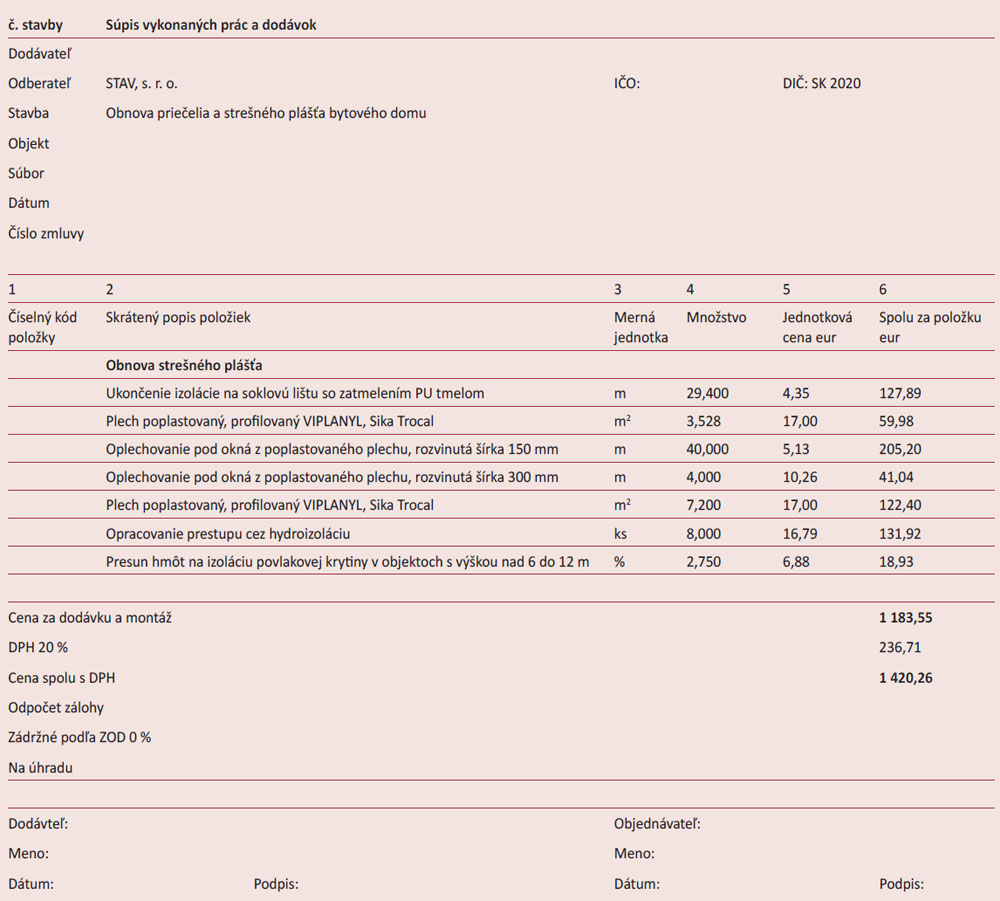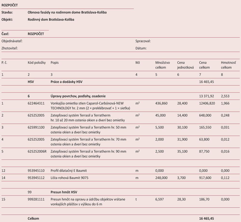 Medzi základné dokumenty, ktoré by mali vlastníci bytov pred začatím obnovy bytového domu požadovať, patrí okrem riadne vypracovanej zmluvy o dielo a projektovej dokumentácie (vykonávací projekt) aj cenová kalkulácia. Dodržanie jednotlivých položiek rozpočtu je pre dodávateľa stavebných a montážnych prác záväzné, pokiaľ sa cena dohodne ako pevná. Kontrola dodržania cenovej kalkulácie padá na plecia samotných vlastníkov bytov. Ak sa počas stavebných prác vyskytnú neočakávané situácie, ktoré si vyžiadajú práce navyše, je nutné požadovať ich jednoznačné ocenenie a vypracovanie dodatku k zmluve.
