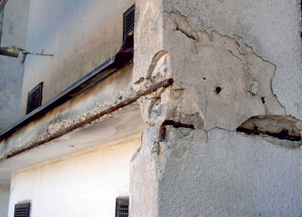 - rýchlym postupom karbonatácie betónu spôsobujúcim jeho degradáciu, oddeľovanie od výstuže a odpadávanie jeho kusov,