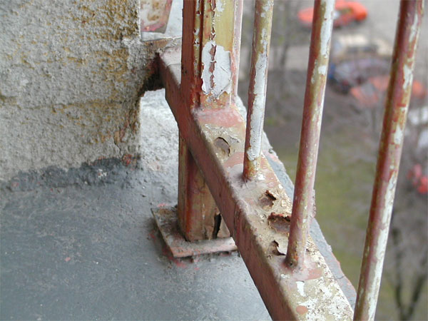 - koróziou prvkov zábradlia aj vlastných nosných profilov zábradlia a nosných zvarov,