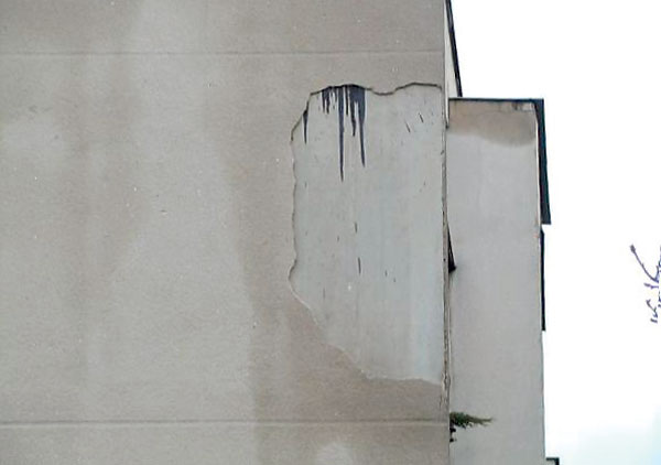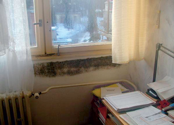| Obr. 2 Výskyt plesní na vnútornom povrchu spôsobený tepelným mostom. Situácia je zhoršená aj zatekaním v dôsledku porušenia obvodového parapetného dielca. | Obr. 3 Príklad degradácie povrchových úprav obvodových stien |