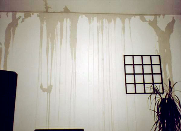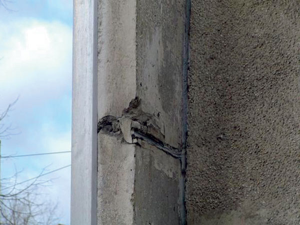 | Obr. 4 Trhliny v škárach medzi obvodovými panelmi a zvislými nosnými stenami | Obr. 5 Zatekanie do interiérov bytov v dôsledku degradovaného tesnenia škár medzi jednotlivými obvodovými dielcami. Na obrázku vpravo vidieť snahu o dodatočné pretesnenie. |
