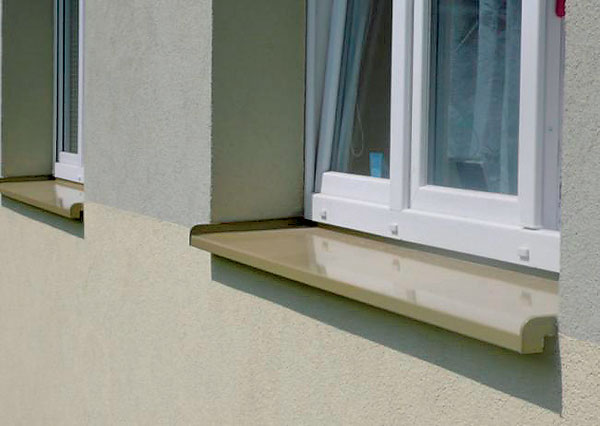 | Obr. 8 Príklad dokotvenia priečelných dielcov k nosnej konštrukcii pri stavebnej sústave T 06 B | Obr. 9 Príklad komplexného prístupu – dôsledné riešenie tepelnoizolačného obkladu vrátane tepelnej izolácie ostenia, nadpražia a parapetu na elimináciu tepelného mosta; osadenie systémového hliníkového parapetu |