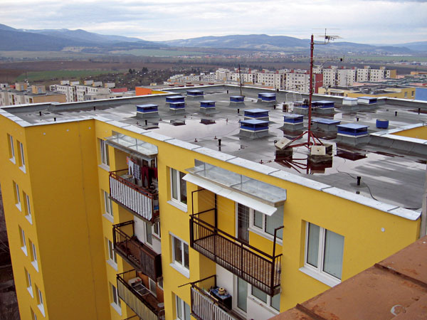 Podľa údajov užívateľov podstrešných bytov panelových domov preniká zrážková voda cez strešnú konštrukciu do interiérov domu už od začiatku užívania bytov. Aj po realizovaných opravách, obnove a rekonštrukciách povlakovej krytiny prenikanie vody do podstrešných priestorov domu pretrváva. V dôsledku nesprávneho spádovania povrchu povlakovej krytiny plochej strechy sa na povrchu krytiny vytvárajú kaluže. Je to dôsledok navrhovania a realizovania bezspádových plochých striech. Kaluže urýchľujú starnutie povlakovej krytiny, ktoré nie je rovnomerné na celom povrchu krytiny.