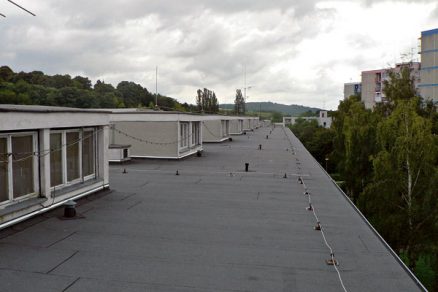 Plochá strecha je dvojplášťová s napojenou vzduchovou vrstvou na vonkajšie ovzdušie. Tepelnoizolačná vrstva v dolnom plášti je z penového polystyrénu s hrúbkou 30 + 20 mm. Horný plášť je z keramických panelov s hrúbkou 140 mm a povlaková krytina je z dvoch vrstiev asfaltovaných pásov IPA. Nosná strešná konštrukcia je zo železobetónového panelu s hrúbkou 150 mm. Vypočítaný tepelný odpor konštrukcie je