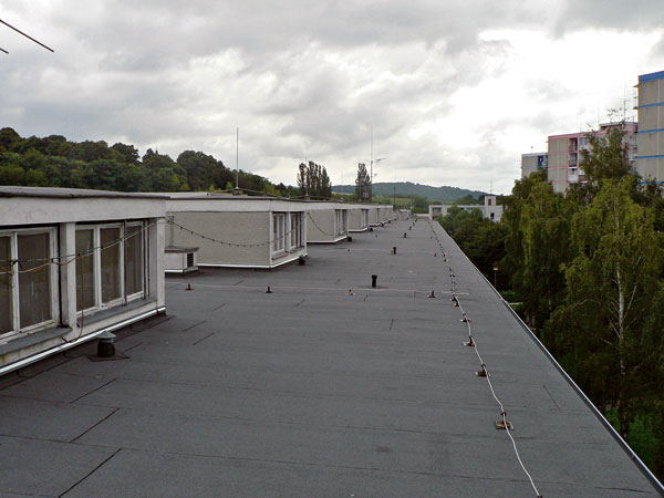 Plochá strecha je dvojplášťová so vzduchovou vrstvou. V atike sú vetracie kanáliky s veľkosťou 20 × 40 mm, ktoré prechádzajú po celej výške atikového dielca. Nosná strešná konštrukcia je zo železobetónu hrúbky 150 mm; na jeho povrchu je uložená lepenka. Horný plášť, ktorý zároveň tvorí tepelnoizolačnú vrstvu strechy, je z veľkorozmerového pórobetónového panelu s hrúbkou 250 mm. Povlaková krytina je z dvoch vrstiev asfaltovaných pásov. Vypočítaný tepelný odpor konštrukcie je R = 1,632 m2 . K/W a súčiniteľ prechodu tepla je U = 0,556 W/(m2 . K).