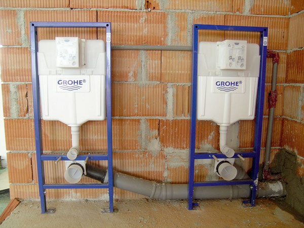 Staré pripájacie potrubia sa viedli pod omietkou a často tiež v podlahách a stropných konštrukciách. Netesnosti týchto potrubí boli často príčinou zatekania do stropných konštrukcií. Nové pripájacie potrubie treba viesť v prímurovkách predstenových inštalácií alebo tiež pod omietkou stien (ak majú malý priemer, je to však menej vhodné). Predstenové inštalácie umožňujú napríklad vedenie potrubia od závesnej záchodovej misy nad podlahou (obr. 1). Vedenie potrubia v podlahe však nie je nutné.