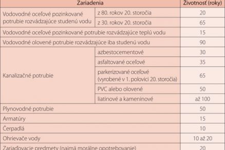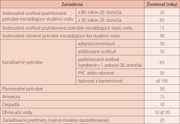 Životnosť potrubíOrientačná životnosť inštalácií a technických zariadení je uvedená v tab. 1. Často dnes nevyhovujú ani pôvodné trasy inštalácií, spôsob prípravy teplej vody a podobne. Preto je nevyhnutná renovácia zdravotnotechnických inštalácií, ktorá často nespočíva iba vo výmene starého potrubia za nové, menia sa pri nej aj svetlosti, tepelné izolácie alebo trasy potrubí a spôsob prípravy teplej vody.