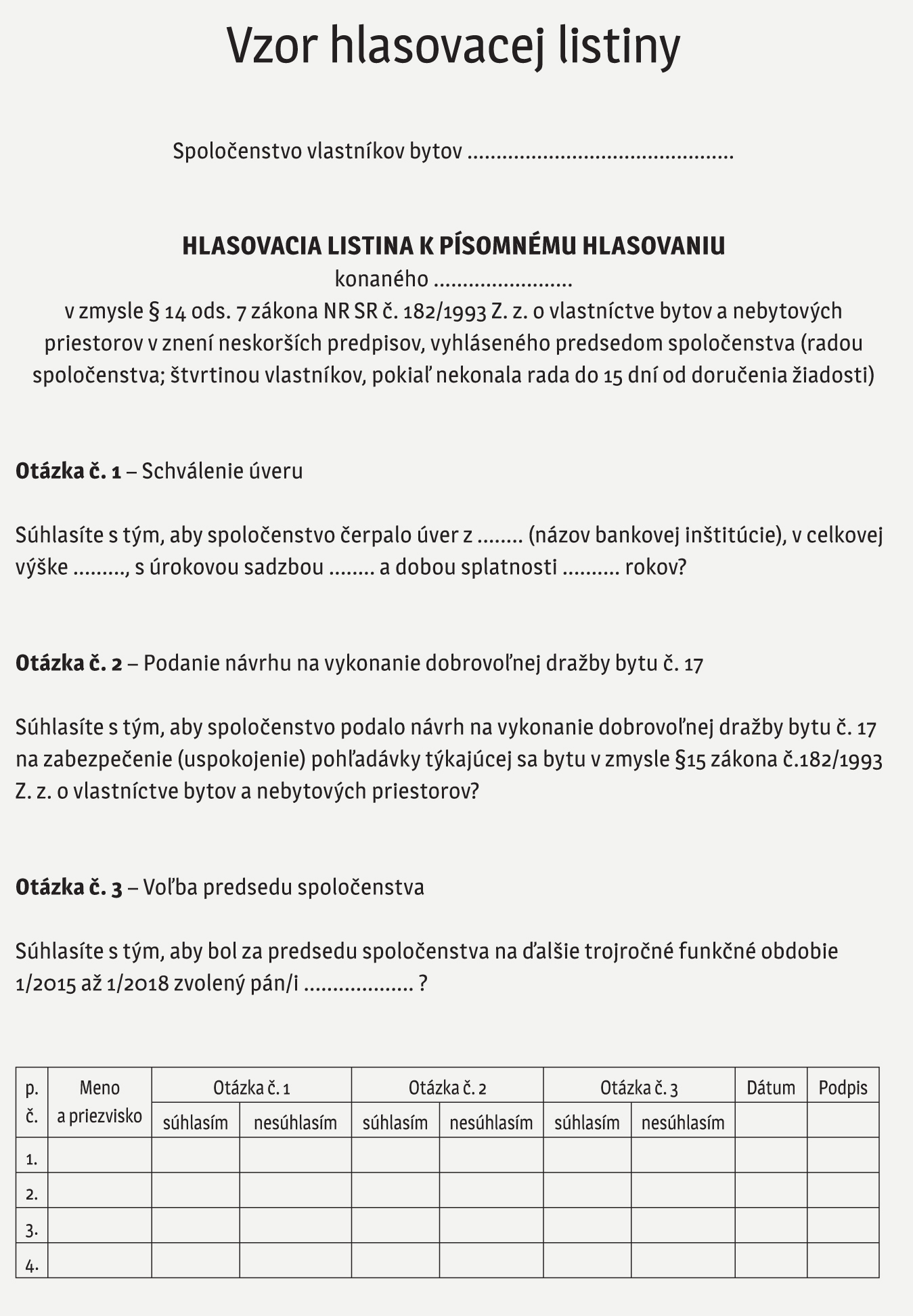 Oznámenie o písomnom hlasovaní musí obsahovať termín hlasovania, miesto hlasovania (kancelária spoločenstva, priestory bytového domu) a konkrétne otázky, o ktorých sa bude hlasovať.