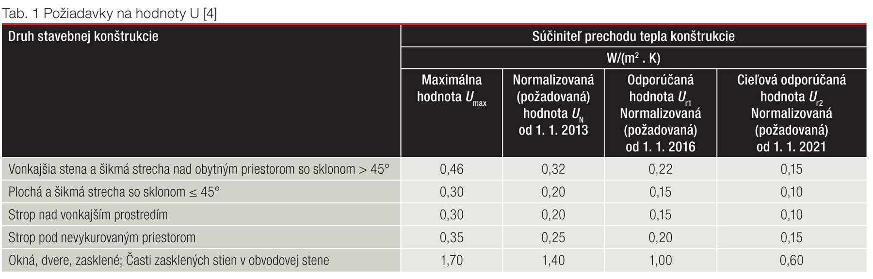 Z uvedených výsledkov hodnotenia vyplynula potreba úpravy požiadavky na hodnotu súčiniteľa prechodu tepla strešnej konštrukcie. Zmena normy STN 73 0540-2/Z1: 2016 [4] nadobudla účinnosť od 1. augusta 2016. Normalizovaná požiadavka sa zmenila na hodnotu 0,15 W/(m2 . K) pre strešný plášť ultranízkoenergetických budov, ale aj pre konštrukcie nad vonkajším prostredím.