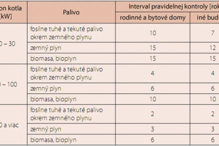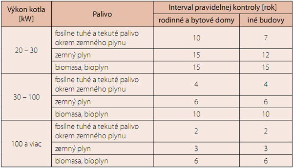 Tab. 1 Interval pravidelnej kontroly kotlov v závislosti od menovitého výkonu kotla, druhu spaľovaného paliva a kategórie budovy