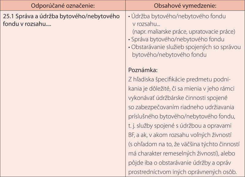Odporúčané označenie činnosti 25. v oblasti nehnuteľnosti a prenájom