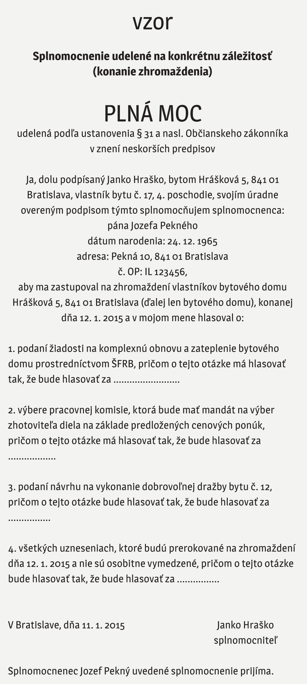 • meno a priezvisko, adresu trvalého pobytu, rodné číslo, resp. dátum narodenia splnomocnenej osoby;