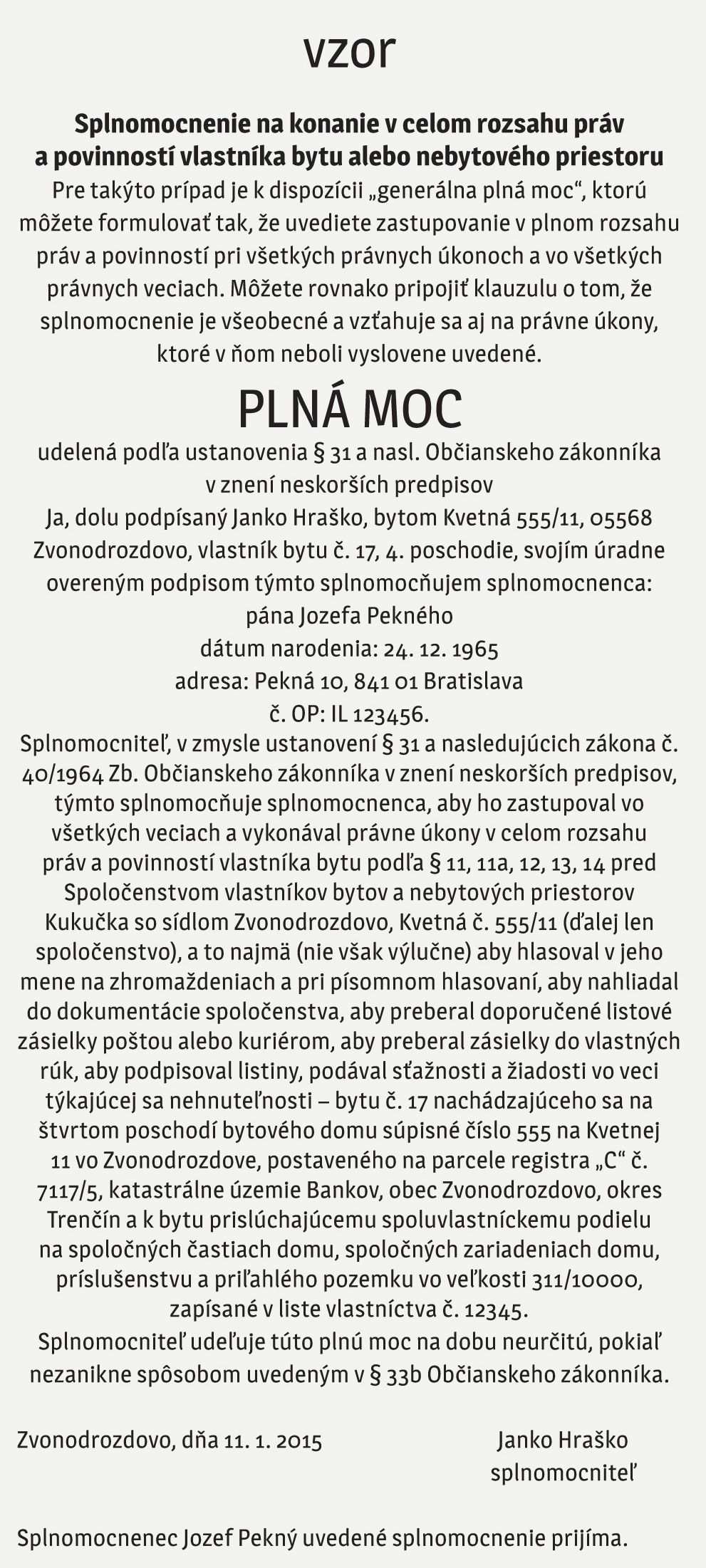 Novela zákona o vlastníctve bytov a nebytových priestorov č. 205/2014 Z. z. priniesla viacero spresnení a podrobností súvisiacich s obsahom splnomocnenia, ktorým môže oprávnený vlastník bytu alebo nebytového priestoru splnomocniť zastupovaním inú osobu.