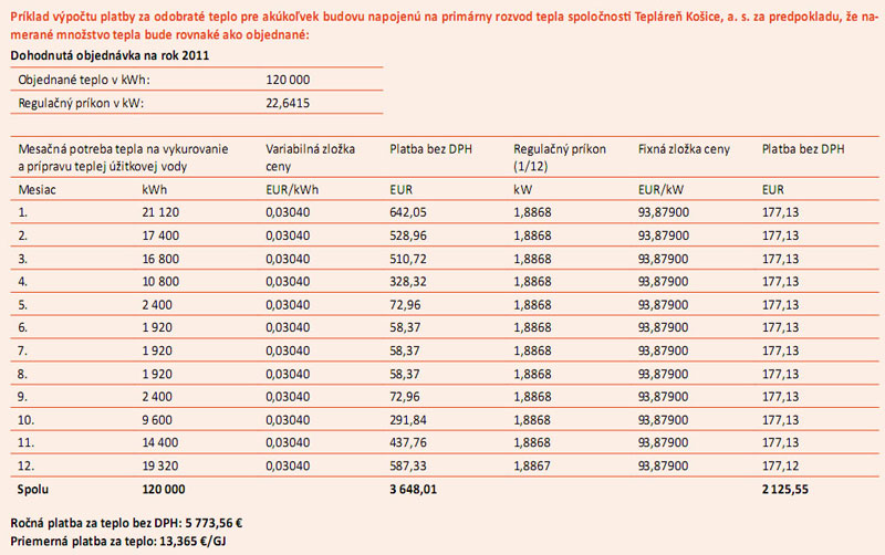 Cena tepla je rozdelená na fixnú a variabilnú zložku. Od roku 2009 sa platba za fixnú zložku určuje podľa regulačného príkonu na odbernom mieste v €/kW a počas roka sa nemení. V podstate je to platba odberateľa tepla za pripojenie do siete. Odberateľ môže svojou spotrebou ovplyvňovať len platbu za variabilnú zložku, ktorá sa vypočítava v €/kWh, podľa nameraného odobratého množstva tepla.Používanie dvojzložkovej ceny tepla ako hlavný spôsob účtovania cien tepelnej energie je bežný v štátoch Európskej únie a prispieva k sprehľadneniu finančných vzťahov medzi výrobcom tepla a jeho odberateľmi. Na Slovensku ceny tepla reguluje Úrad pre reguláciu sieťových odvetí SR (URSO).