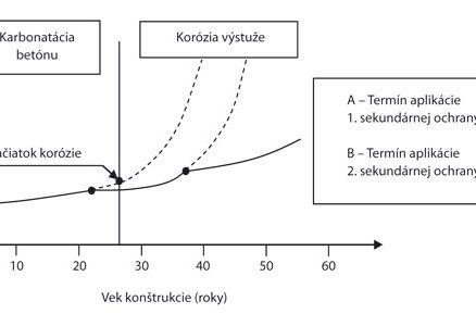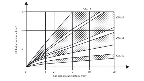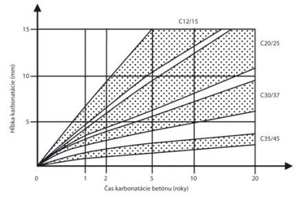 Na obr. 1 je vykreslený predpokladaný priebeh karbonatácie betónov rôznych tried. Z obrázku je zrejmé, že kvalitnejší betón poskytuje výstuži dlhší čas alkalickú ochranu.