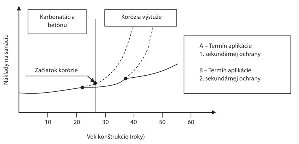 V súčasnosti sa prehliadky obytných budov robia väčšinou až po zistení porúch. Voči takému pasívnemu postupu možno mať výhrady aj z hľadiska bezpečnosti. Za uváženie však stojí aj skutočnosť, že náklady na odstránenie poruchy v pokročilom štádiu niekoľkonásobne prevyšujú náklady na včas realizovanú ochranu. Táto skutočnosť je na obr. 2 znázornená na príklade železobetónovej konštrukcie ohrozenej koróziou výstuže. Náklady na včas realizovanú sekundárnu ochranu dosahujú úroveň (A) a sú zlomkom nákladov na rekonštrukciu v pokročilom štádiu korózie výstuže.