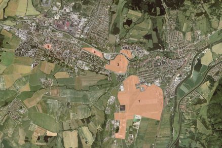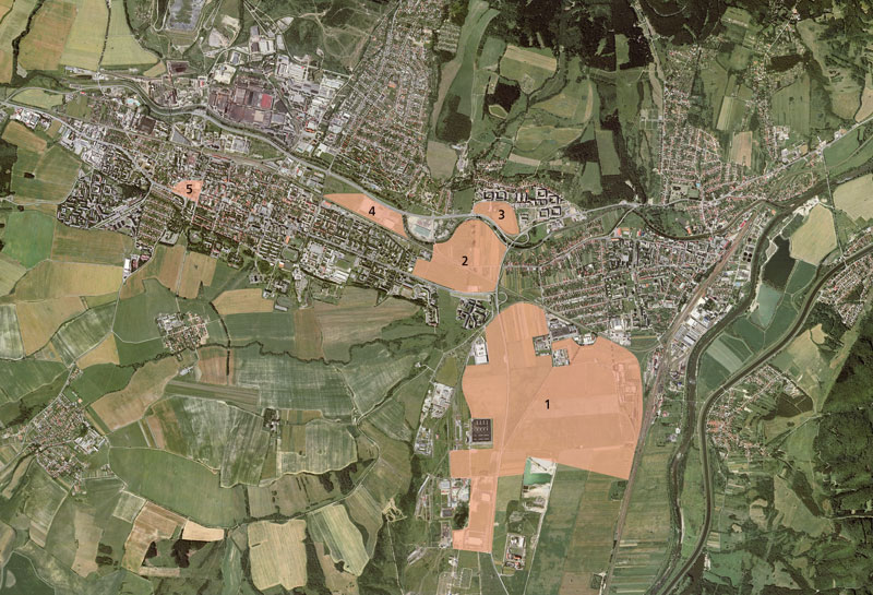 1 – Východný priemyselný park, 2 – rozvojové územie mestskej časti Košťany, 3 – rozvojové územie mestskej časti Záturčie, 4 – investičný zámer polyfunkčného centra pri pešej