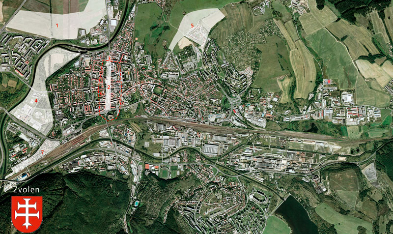 1 – rozvojové lokality Tepličky, Čierne zeme, 2 – Námestie SNP, 3 – územie výstavby Europa Business Centra a Europa Relax Centra, 4 – rozvojové lokality Lanice a Dolné Lanice, 5 – rozvojové územie Sarvaška, 6 – hranica pamiatkovej zóny, 7 – rozvojová lokalita Balkán