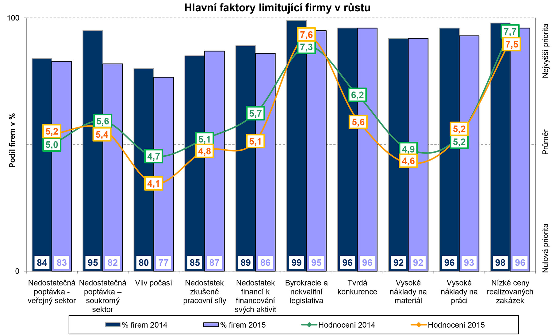 Riaditelia stavebných spoločností sa pri tohtoročnom výskume najčastejšie sťažovali na byrokraciu zo strany štátu a nekvalitnú legislatívu. Tá podľa nich bráni rýchlejšiemu rozvoju ich podnikania. Na stupnici od nuly do desiatky, kde desiatka predstavuje limity, ktoré ohrozujú existenciu firiem, tento faktor ohodnotili číslom 7,6. Vo svojich hodnoteniach riaditelia firiem pritom od roku 2012 stále pritvrdzujú. Práve v roku 2012 označili zmienený faktor číslom 7,1, v roku 2014 bolo číslo o ďalšie dve desatiny bodu vyššie (7,3).